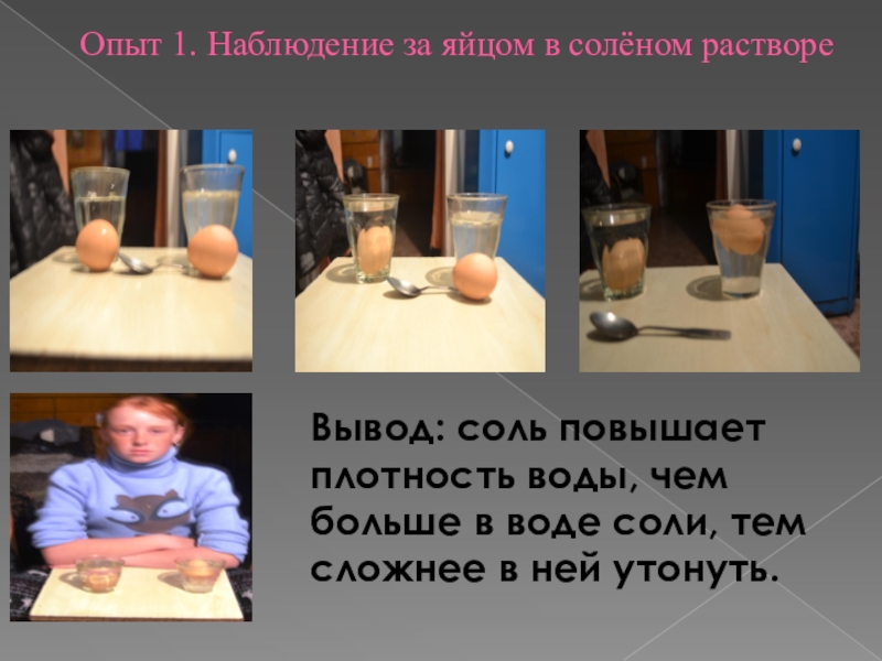 Слайд 20Опыт 1. Наблюдение за яйцом в солёном растворе