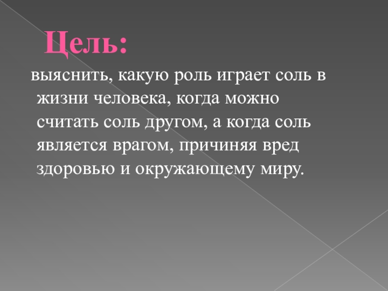 Цель: выяснить, какую роль играет соль в жизни человека, когда можно считать соль другом, а когда соль