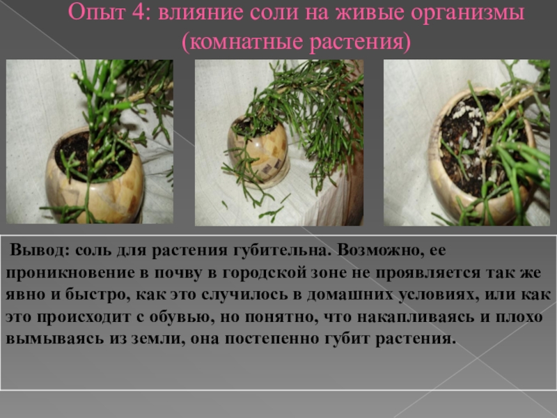 Опыт 4: влияние соли на живые организмы  (комнатные растения)