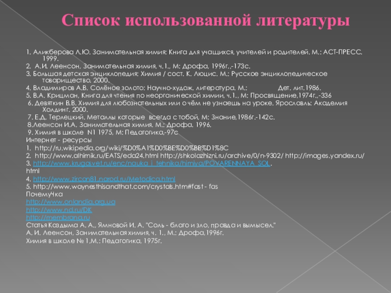 Список использованной литературы 1. Аликберова Л.Ю. Занимательная химия: Книга для учащихся, учителей и родителей. М.: АСТ-ПРЕСС. 1999.2. А.И.