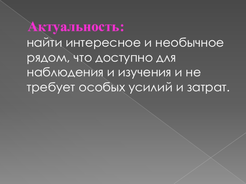 Актуальность:  найти интересное и необычное рядом, что доступно для наблюдения и изучения и не требует особых
