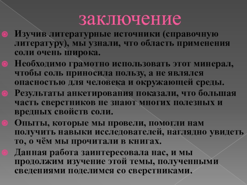 заключениеИзучив литературные источники (справочную литературу), мы узнали, что область применения соли очень широка.Необходимо грамотно использовать этот минерал,