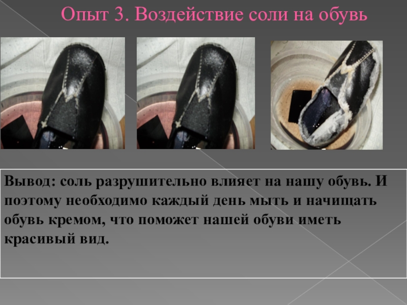 Слайд 22Опыт 3. Воздействие соли на обувь