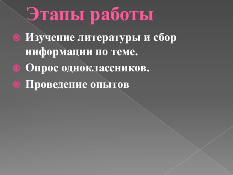 Этапы работы Изучение литературы и сбор информации по теме.Опрос одноклассников.Проведение опытов