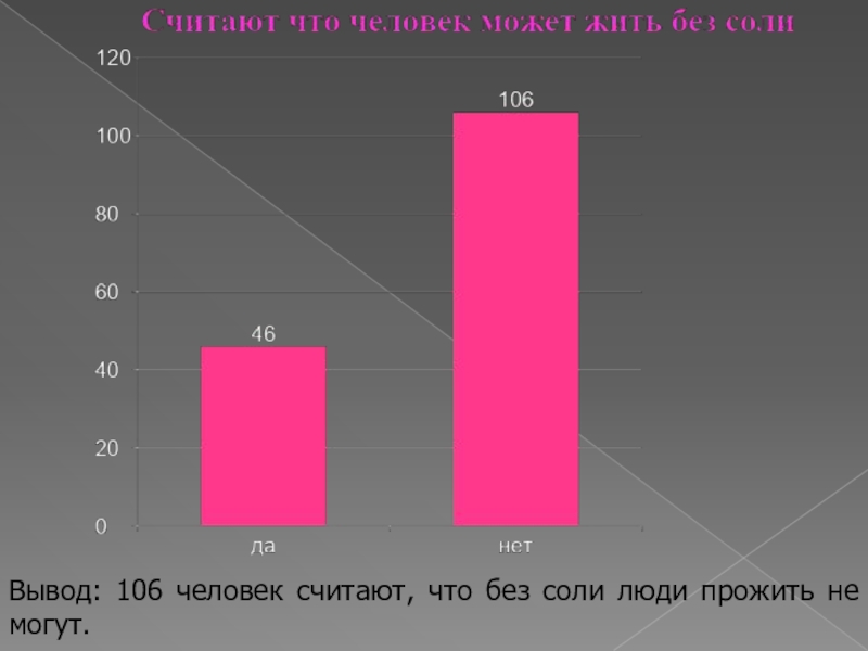 Слайд 16Вывод: 106 человек считают, что без соли люди прожить не могут.
