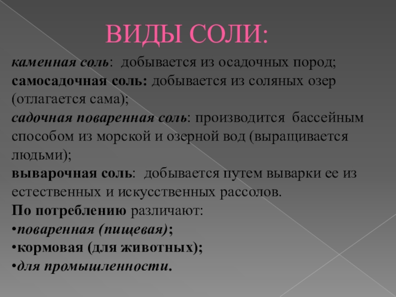 ВИДЫ СОЛИ:каменная соль: добывается из осадочных пород; самосадочная соль: добывается из соляных озер (отлагается сама);  садочная