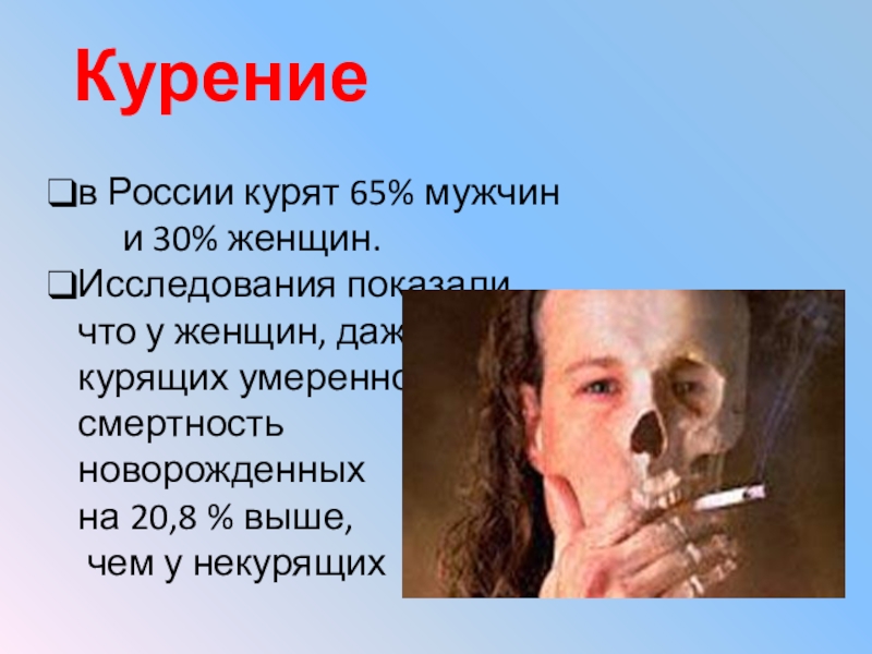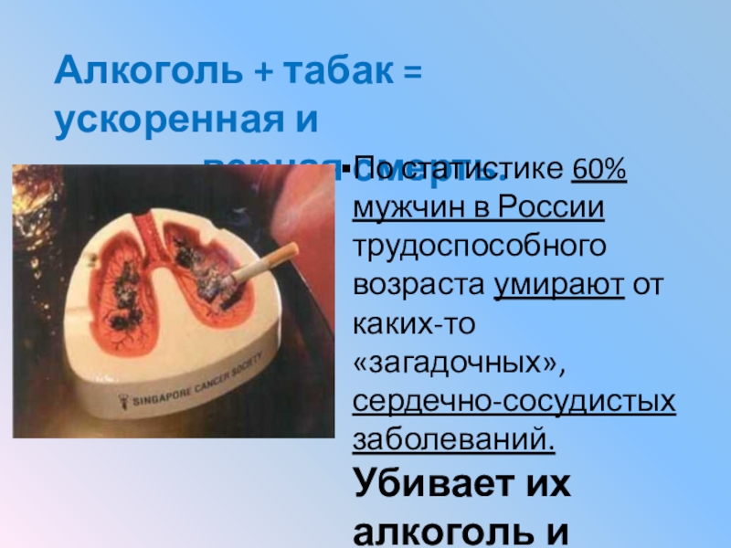 По статистике 60% мужчин в России трудоспособного возраста умирают от каких-то «загадочных», сердечно-сосудистых заболеваний. Убивает их алкоголь и табак.