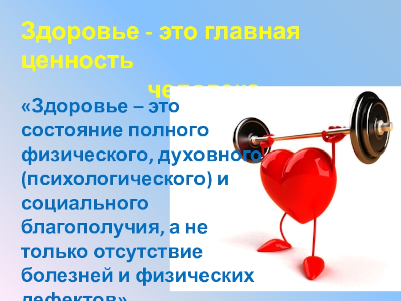 «Здоровье – это состояние полного физического, духовного (психологического) и социального благополучия, а не только отсутствие болезней и физических дефектов»