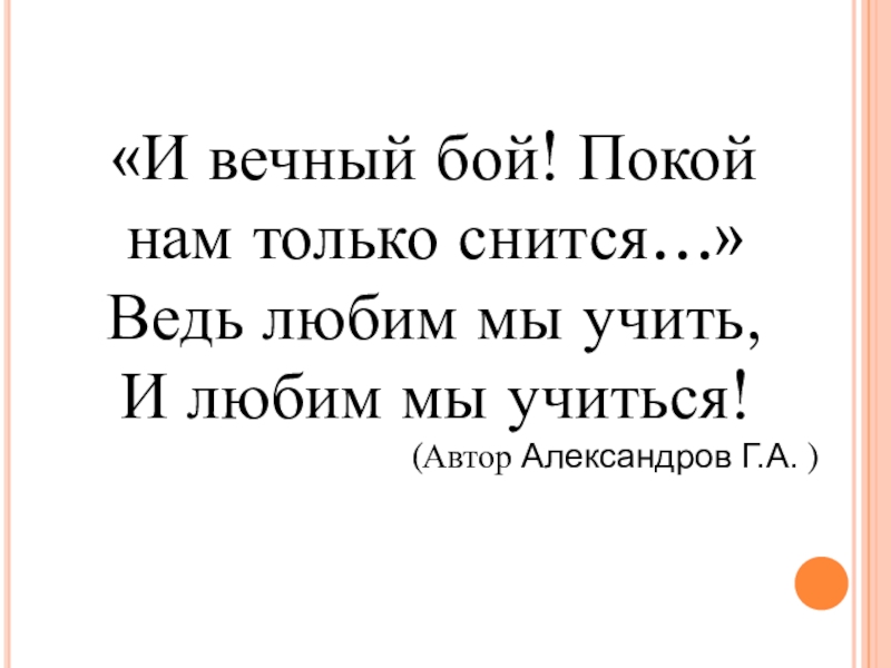 «И вечный бой! Покой нам только снится…»Ведь любим мы учить, И любим мы учиться!(Автор Александров Г.А. )