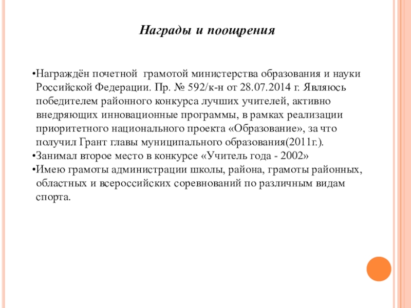 Федерации. Пр. № 592/к-н от 28.07.2014 г. Являюсь победителем районного конкурса лучших учителей, активно внедряющих инновационные программы, в рамках реализации приоритетного национального проекта «Образование», за что получил Грант главы муниципального образования(2011г.).