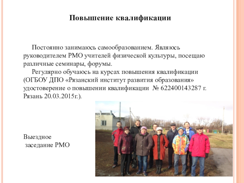 Повышение квалификации   Постоянно занимаюсь самообразованием. Являюсь руководителем РМО учителей физической культуры, посещаю различные семинары, форумы.