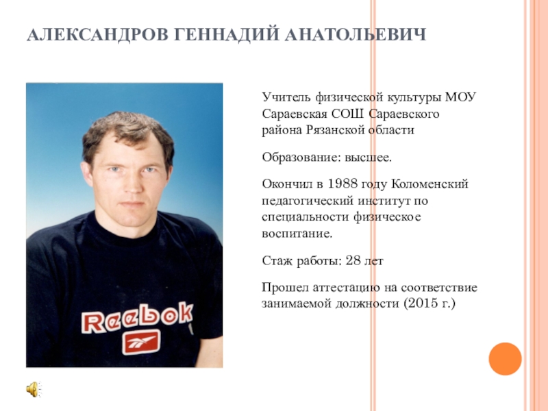 АЛЕКСАНДРОВ ГЕННАДИЙ АНАТОЛЬЕВИЧУчитель физической культуры МОУ Сараевская СОШ Сараевского района Рязанской областиОбразование: высшее.Окончил в 1988 году Коломенский
