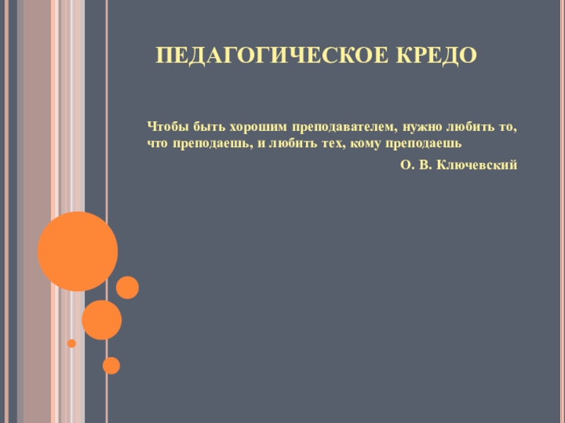 ПЕДАГОГИЧЕСКОЕ КРЕДОЧтобы быть хорошим преподавателем, нужно любить то, что преподаешь, и любить тех, кому преподаешьО. В. Ключевский