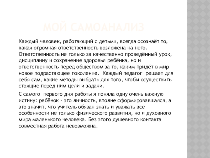 С самого первого дня работы я поняла одну очень важную истину: ребёнок – это личность, вполне сформировавшаяся, а это значит, что учитель обязан знать и уважать все особенности не только физического развития, но и духовного мира маленького человека. Без этого душевного контакта совместная работа невозможна.