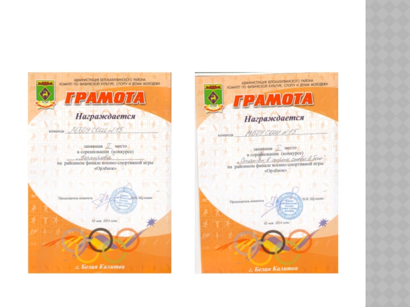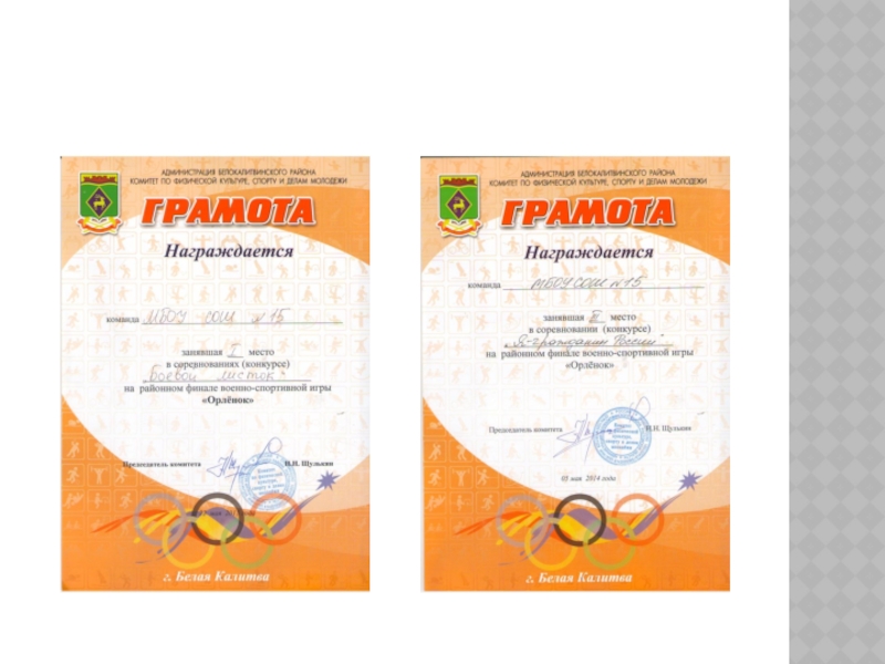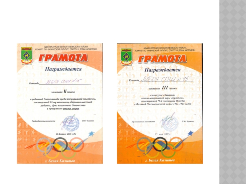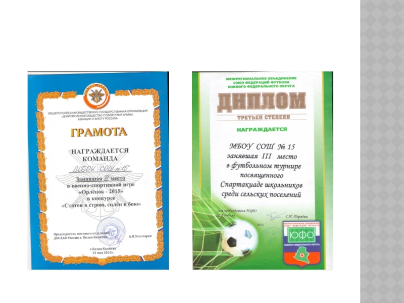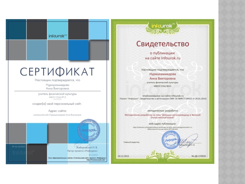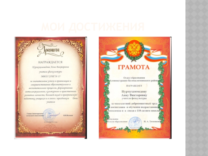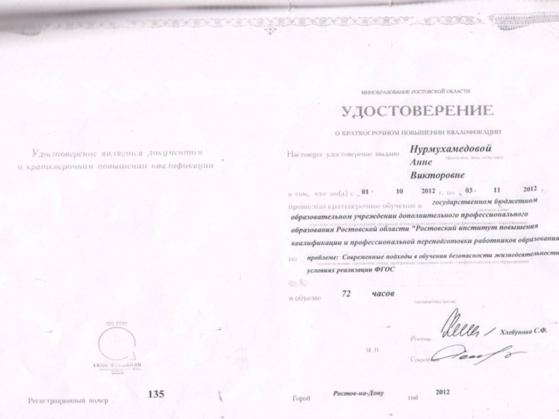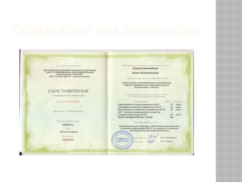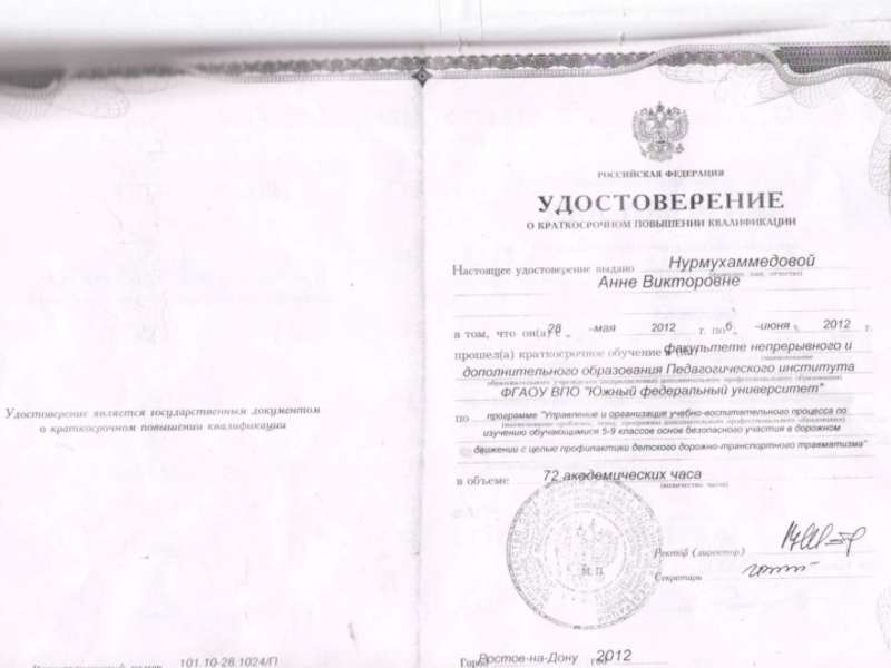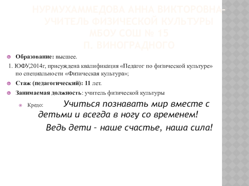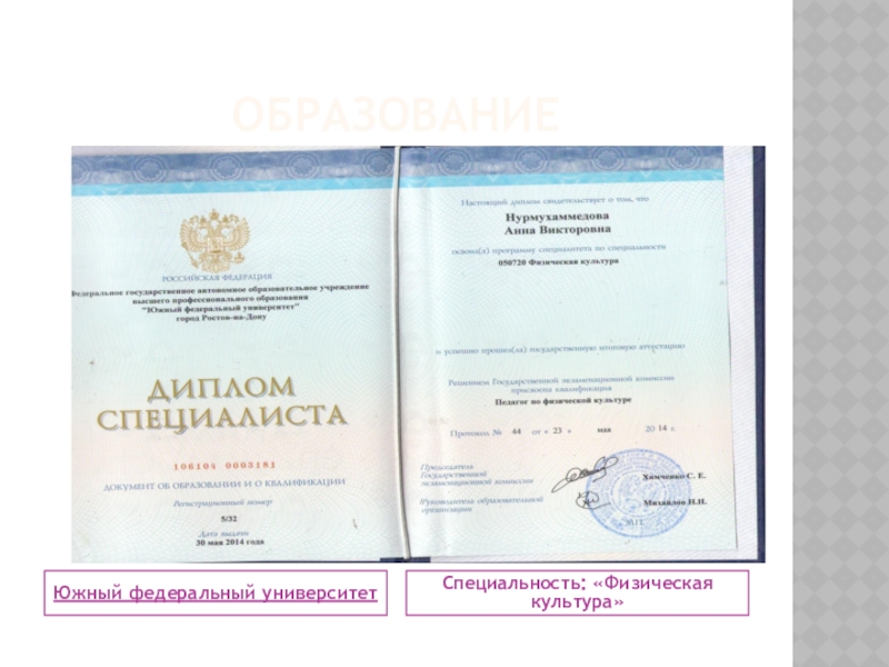 1. ЮФУ,2014г, присуждена квалификация «Педагог по физической культуре» по специальности «Физическая культура»;