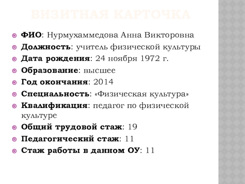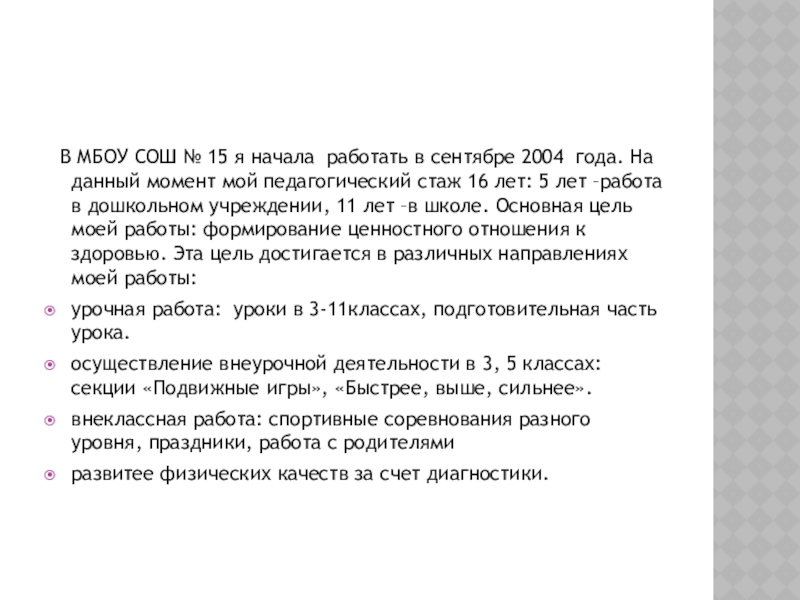 2004 года. На данный момент мой педагогический стаж 16 лет: 5 лет –работа в дошкольном учреждении, 11 лет –в школе. Основная цель моей работы: формирование ценностного отношения к здоровью. Эта цель достигается в различных направлениях моей работы: