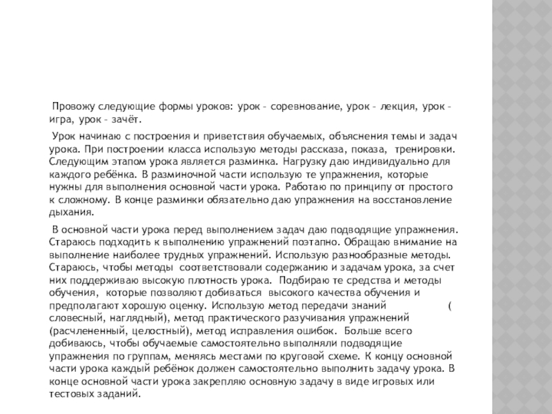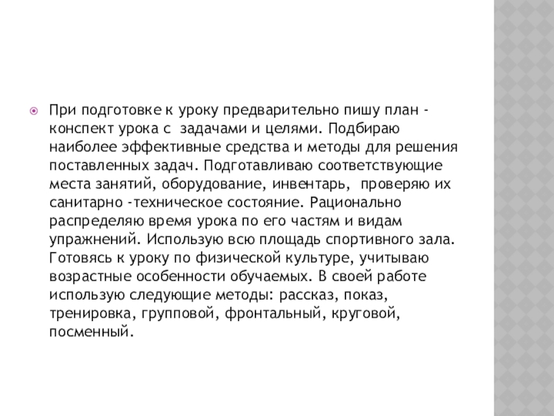 задачами и целями. Подбираю наиболее эффективные средства и методы для решения поставленных задач. Подготавливаю соответствующие места занятий, оборудование, инвентарь, проверяю их санитарно -техническое состояние. Рационально распределяю время урока по его частям и видам упражнений. Использую всю площадь спортивного зала. Готовясь к уроку по физической культуре, учитываю возрастные особенности обучаемых. В своей работе использую следующие методы: рассказ, показ, тренировка, групповой, фронтальный, круговой, посменный.