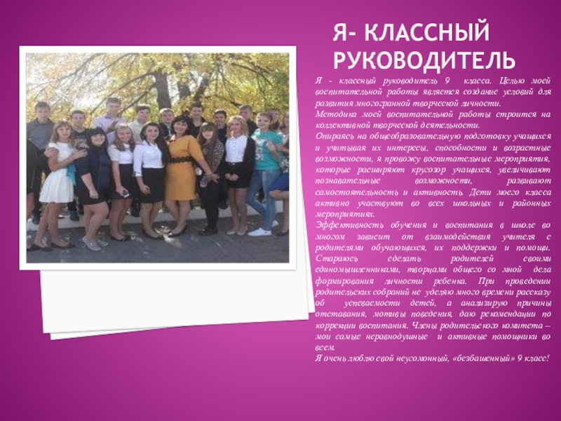 Я - классный руководитель 9 класса. Целью моей воспитательной