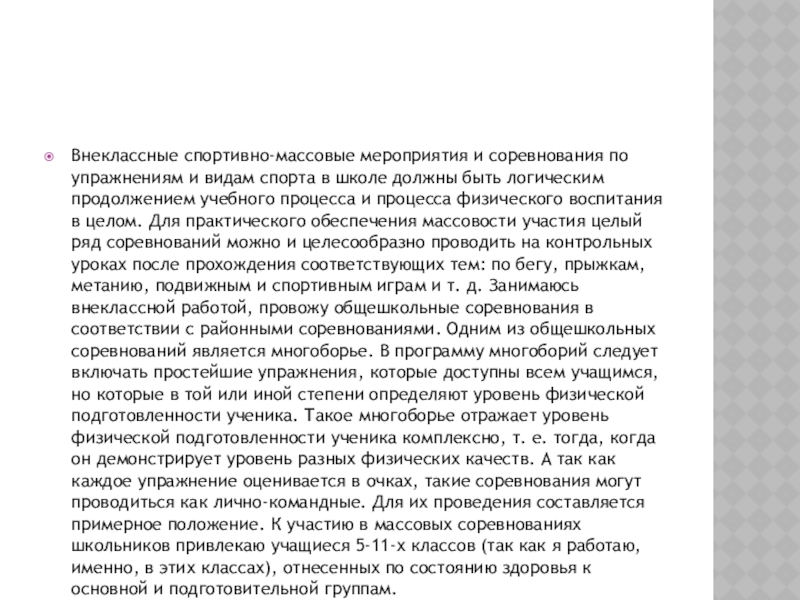 Слайд 18Внеклассные спортивно-массовые мероприятия и соревнования по упражнениям и видам спорта в