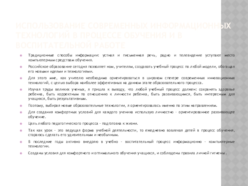 В последние годы активно внедряю в учебно – воспитательный процесс информационно – компьютерные технологии.