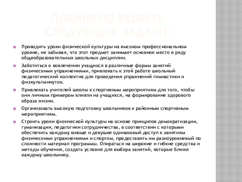 Строить уроки физической культуры на основе принципов демократизации, гуманизации, педагогики сотрудничества, в соответствии с которыми обеспечить каждому юноше и девушке одинаковый доступ к занятиям физическими упражнениями и спортом, предоставить им разноуровневый по сложности материал программы. Опираться на широкие и гибкие средства и методы обучения, создать условия для выбора занятий, которые ближе каждому школьнику.