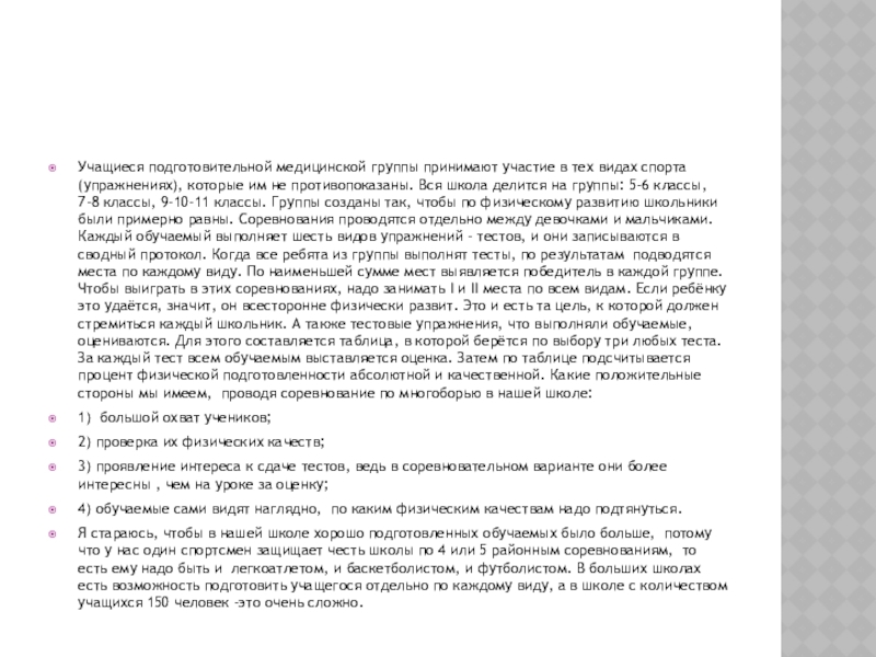 Слайд 19Учащиеся подготовительной медицинской группы принимают участие в тех видах спорта (упражнениях),