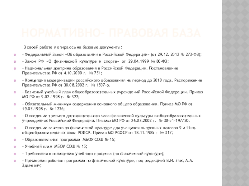 - Федеральный Закон «Об образовании в Российской Федерации» (от 29.12. 2012 № 273-ФЗ);