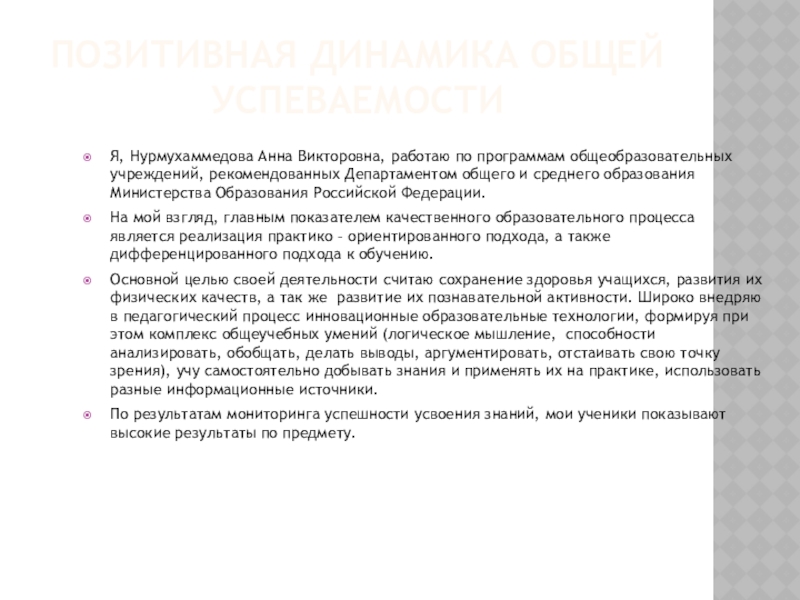 Основной целью своей деятельности считаю сохранение здоровья учащихся, развития их физических качеств, а так же развитие их познавательной активности. Широко внедряю в педагогический процесс инновационные образовательные технологии, формируя при этом комплекс общеучебных умений (логическое мышление, способности анализировать, обобщать, делать выводы, аргументировать, отстаивать свою точку зрения), учу самостоятельно добывать знания и применять их на практике, использовать разные информационные источники.
