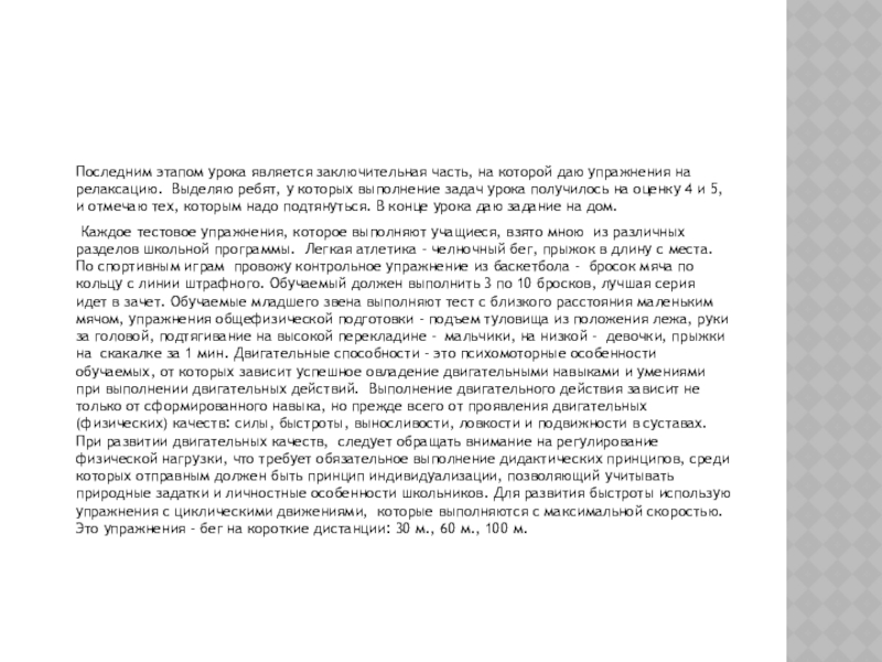 Каждое тестовое упражнения, которое выполняют учащиеся, взято мною из различных разделов школьной программы. Легкая атлетика – челночный бег, прыжок в длину с места. По спортивным играм провожу контрольное упражнение из баскетбола - бросок мяча по кольцу с линии штрафного. Обучаемый должен выполнить 3 по 10 бросков, лучшая серия идет в зачет. Обучаемые младшего звена выполняют тест с близкого расстояния маленьким мячом, упражнения общефизической подготовки - подъем туловища из положения лежа, руки за головой, подтягивание на высокой перекладине - мальчики, на низкой - девочки, прыжки на скакалке за 1 мин. Двигательные способности – это психомоторные особенности обучаемых, от которых зависит успешное овладение двигательными навыками и умениями при выполнении двигательных действий. Выполнение двигательного действия зависит не только от сформированного навыка, но прежде всего от проявления двигательных (физических) качеств: силы, быстроты, выносливости, ловкости и подвижности в суставах. При развитии двигательных качеств, следует обращать внимание на регулирование физической нагрузки, что требует обязательное выполнение дидактических принципов, среди которых отправным должен быть принцип индивидуализации, позволяющий учитывать природные задатки и личностные особенности школьников. Для развития быстроты использую упражнения с циклическими движениями, которые выполняются с максимальной скоростью. Это упражнения – бег на короткие дистанции: 30 м., 60 м., 100 м.