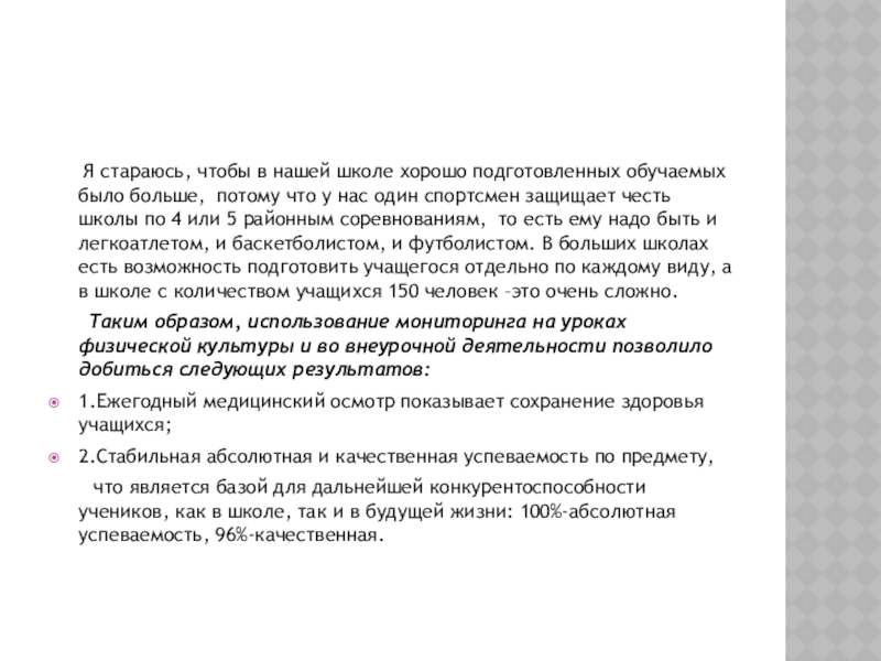 подготовленных обучаемых было больше, потому что у нас один спортсмен защищает честь школы по 4 или 5 районным соревнованиям, то есть ему надо быть и легкоатлетом, и баскетболистом, и футболистом. В больших школах есть возможность подготовить учащегося отдельно по каждому виду, а в школе с количеством учащихся 150 человек –это очень сложно.
