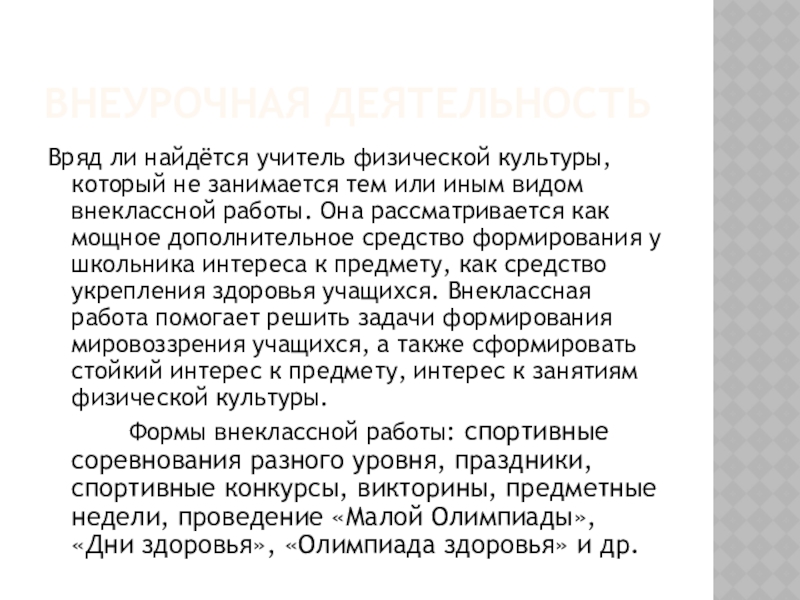 Формы внеклассной работы: спортивные соревнования разного уровня, праздники, спортивные конкурсы, викторины, предметные недели, проведение «Малой Олимпиады», «Дни здоровья», «Олимпиада здоровья» и др.