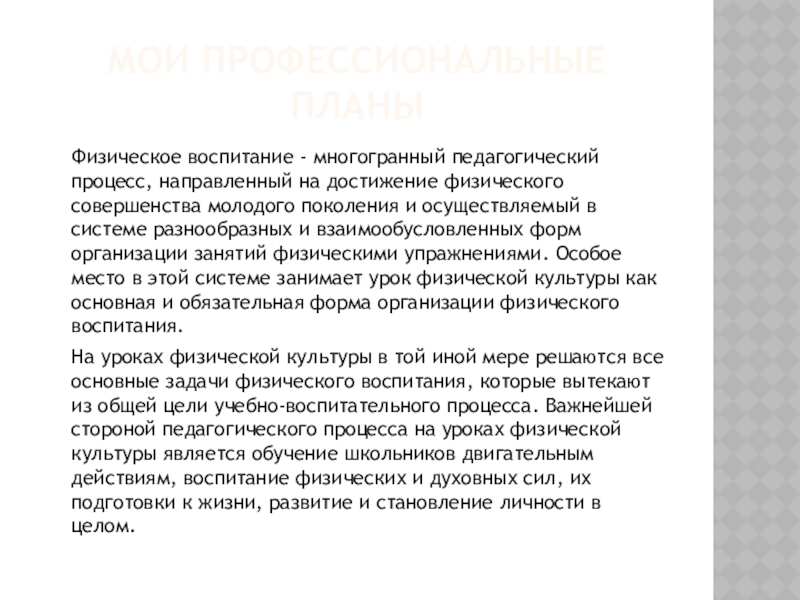 на достижение физического совершенства молодого поколения и осуществляемый в системе разнообразных и взаимообусловленных форм организации занятий физическими упражнениями. Особое место в этой системе занимает урок физической культуры как основная и обязательная форма организации физического воспитания.