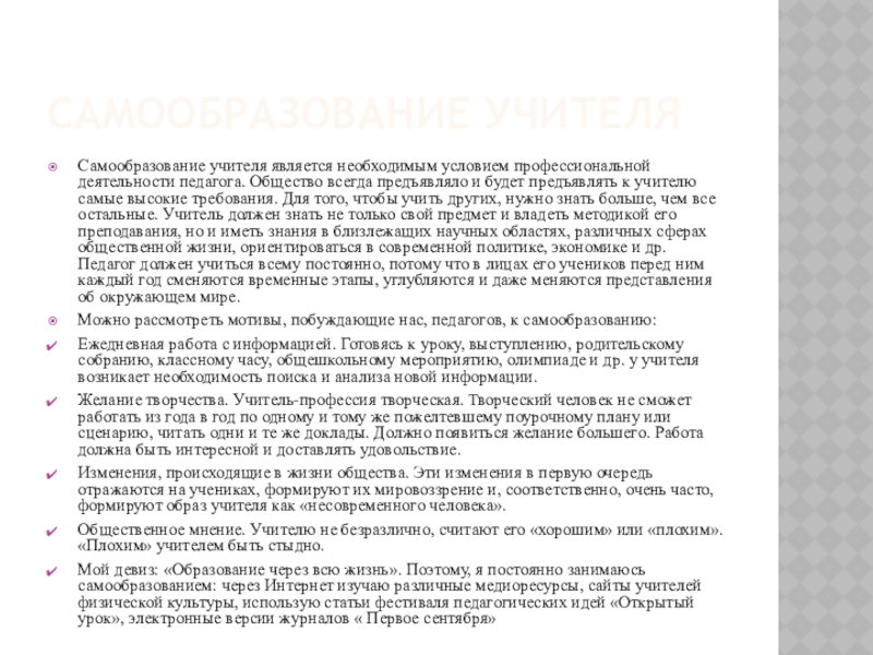 Мой девиз: «Образование через всю жизнь». Поэтому, я постоянно занимаюсь самообразованием: через Интернет изучаю различные медиоресурсы, сайты учителей физической культуры, использую статьи фестиваля педагогических идей «Открытый урок», электронные версии журналов « Первое сентября»