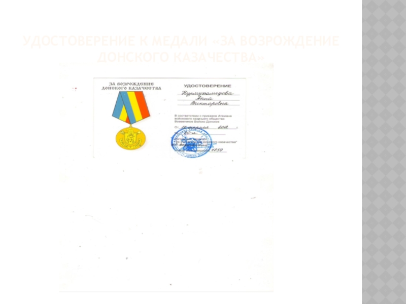Слайд 77Удостоверение к медали «За возрождение донского казачества»