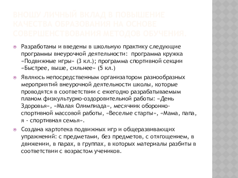 Разработаны и введены в школьную практику следующие программы внеурочной деятельности: программа кружка «Подвижные игры» (3 кл.); программа спортивной секции «Быстрее, выше, сильнее» (5 кл.)