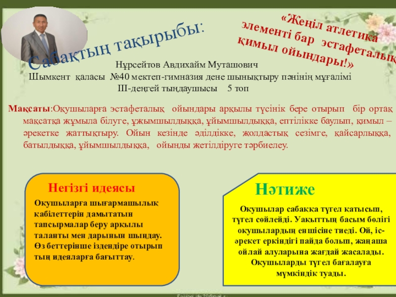 Шымкент қаласы №40 мектеп-гимназия дене шынықтыру пәнінің мұғалімі