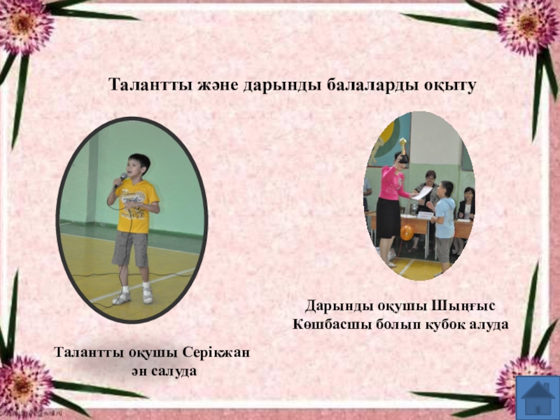 қабілеттерін дамытатын тапсырмалар беру арқылы таланты мен дарынын шыңдау. Өз беттерінше іздендіре отырып тың идеяларға бағыттау.