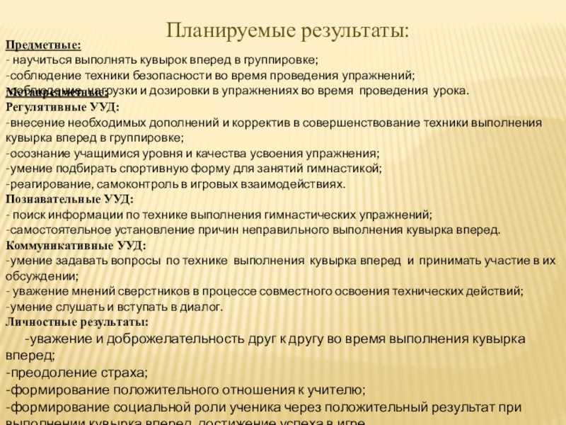-формирование социальной роли ученика через положительный результат при выполнении кувырка вперед, достижение успеха в игре.