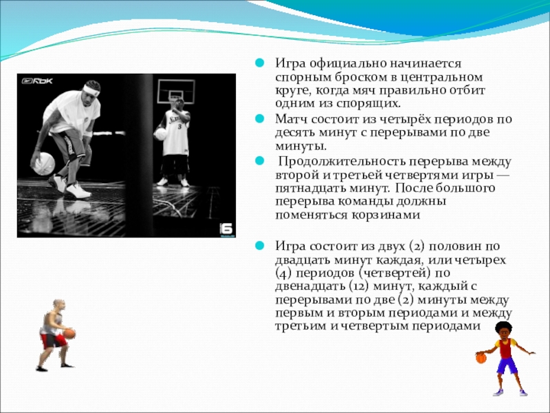 Слайд 9Игра официально начинается спорным броском в центральном круге, когда мяч правильно