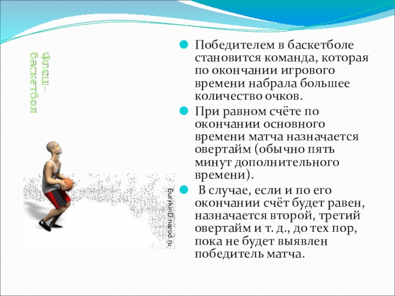 Слайд 7Победителем в баскетболе становится команда, которая по окончании игрового времени набрала