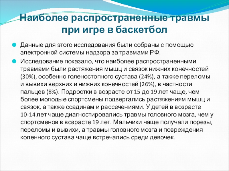 Исследование показало, что наиболее распространенными травмами были растяжения мышц и связок нижних конечностей (30%), особенно голеностопного сустава (24%), а также переломы и вывихи верхних и нижних конечностей (26%), в частности пальцев (8%). Подростки в возрасте от 15 до 19 лет чаще, чем более молодые спортсмены подвергались растяжениям мышц и связок, а также ссадинам и рассечениями. У детей в возрасте 10-14 лет чаще диагностировались травмы головного мозга, чем у спортсменов в возрасте 19 лет. Мальчики чаще получали порезы, переломы и вывихи, а травмы головного мозга и повреждения коленного сустава чаще встречались среди девочек.