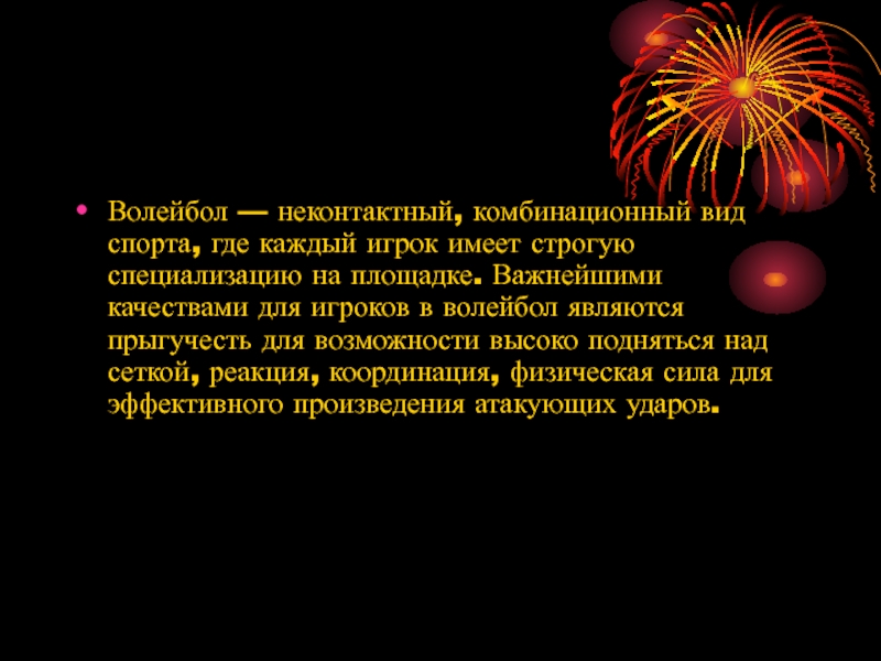 Слайд 4Волейбол — неконтактный, комбинационный вид спорта, где каждый игрок имеет строгую специализацию