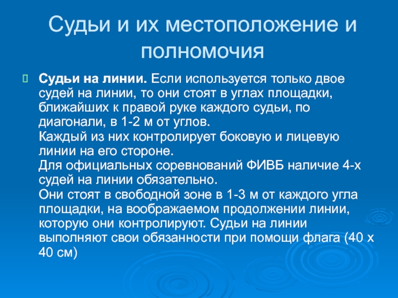 двое судей на линии, то они стоят в углах площадки, ближайших к правой руке каждого судьи, по диагонали, в 1-2 м от углов.