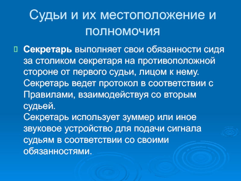 Секретарь использует зуммер или иное звуковое устройство для подачи сигнала судьям в соответствии со своими обязанностями.