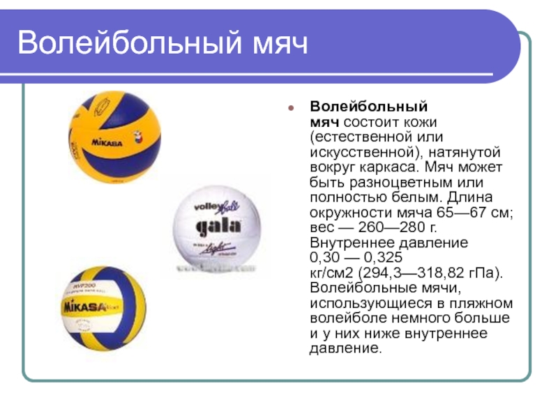может быть разноцветным или полностью белым. Длина окружности мяча 65—67 см; вес — 260—280 г. Внутреннее давление 0,30 — 0,325 кг/см2 (294,3—318,82 гПа). Волейбольные мячи, использующиеся в пляжном волейболе немного больше и у них ниже внутреннее давление.
