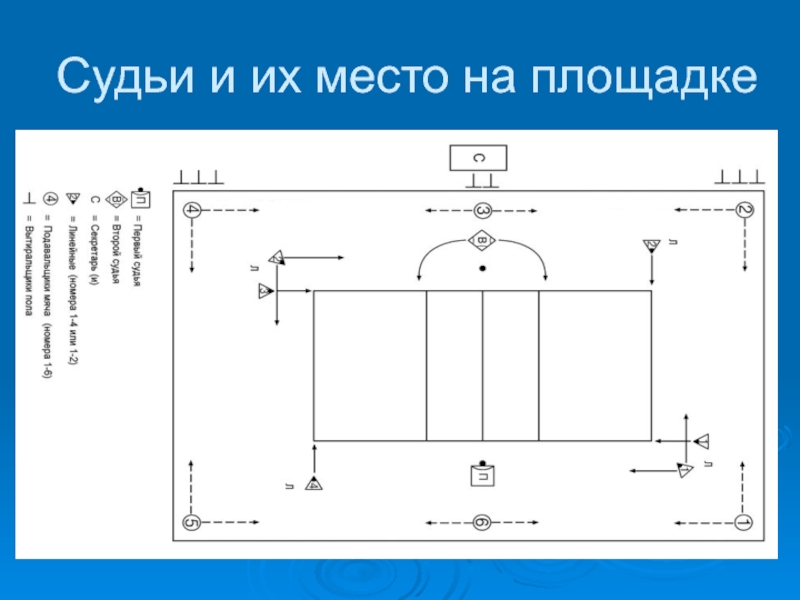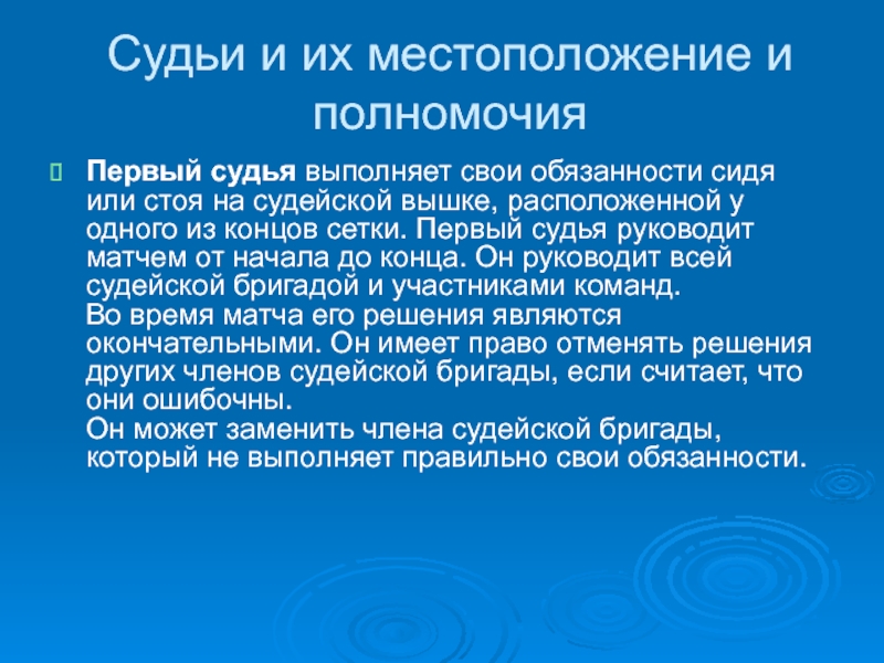 или стоя на судейской вышке, расположенной у одного из концов сетки. Первый судья руководит матчем от начала до конца. Он руководит всей судейской бригадой и участниками команд.