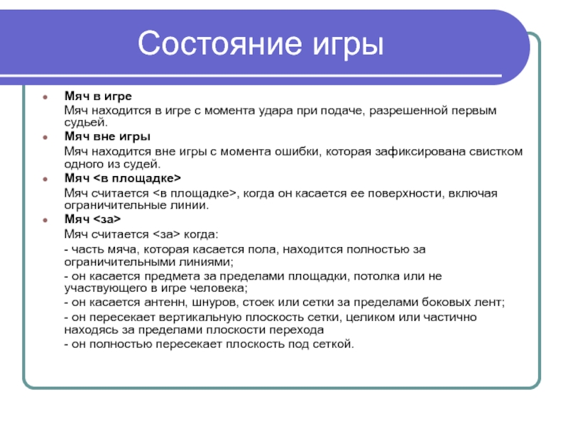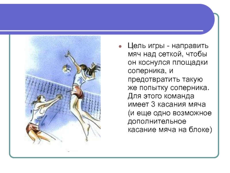 Слайд 10Цель игры - направить мяч над сеткой, чтобы он коснулся площадки