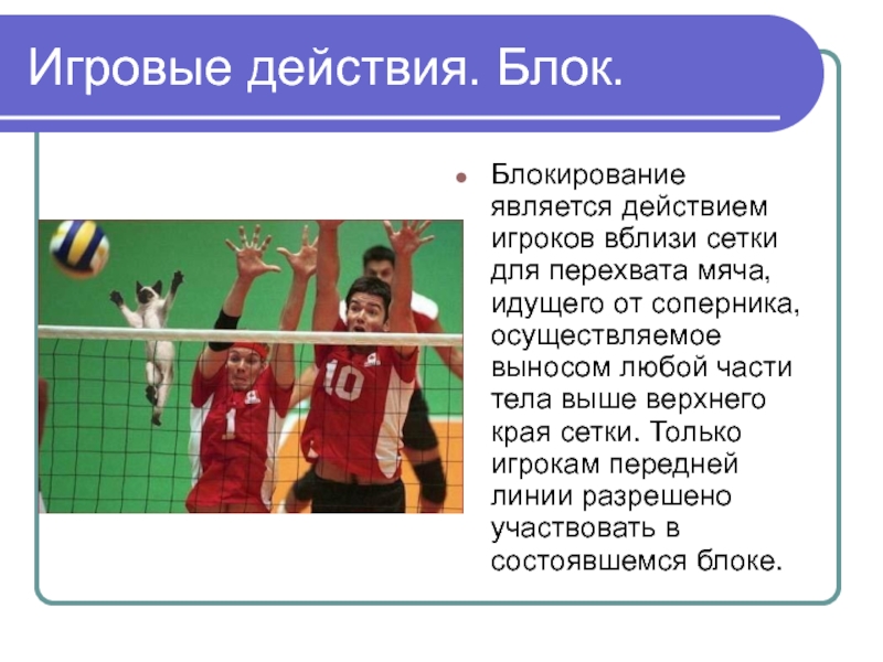 идущего от соперника, осуществляемое выносом любой части тела выше верхнего края сетки. Только игрокам передней линии разрешено участвовать в состоявшемся блоке.