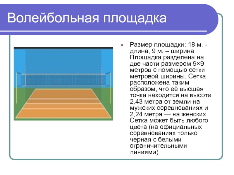 Размер площадки: 18 м. - длина, 9 м. – ширина.
