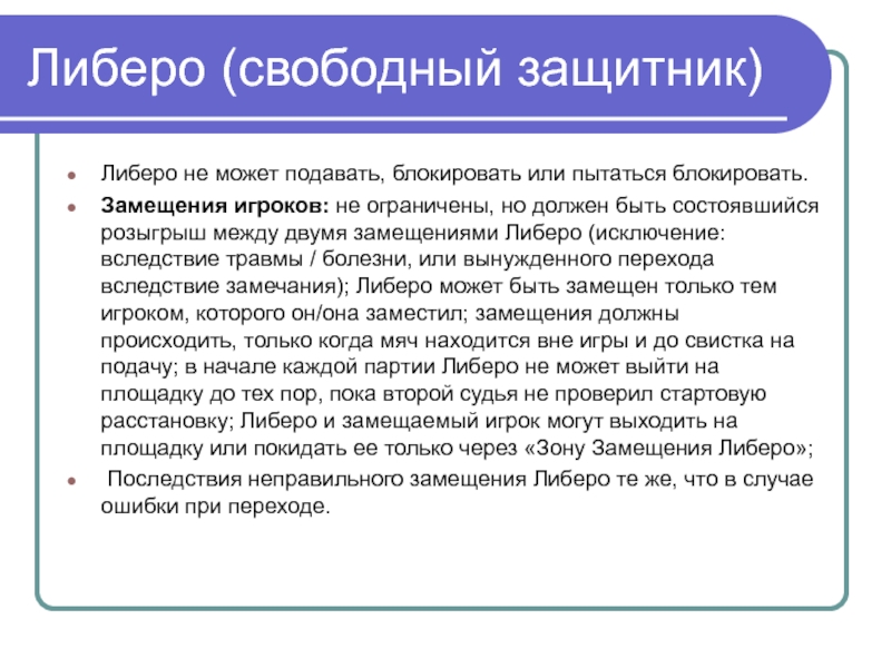 Последствия неправильного замещения Либеро те же, что в случае ошибки при переходе.
